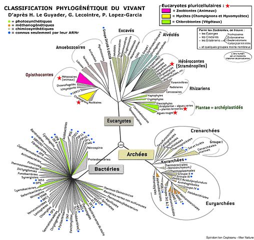 Pour l’instant, ce n’est pas encore tout à fait assez humide pour certaines espèces des plus connues de notre région : les sanguins, les pieds-de-mouton et les girolles. Ces délicieux comestibles dont on peut se régaler tout l’automne si les conditions sont favorables. Il nous faudra attendre encore un peu… un peu plus de pluie, un peu plus de froid… Et donc en attendant leur apparition, je me suis dit que j’allais en profiter pour vous parler un peu de ces champignons qui sont absolument fascinants ! Ni animal, ni végétal, ils appartiennent à un règne bien spécifique : le règne fongique. Cependant, si on regarde l’arbre du vivant, on peut être très surpris·e d’observer que la bifurcation qui a créé la grande famille des eucaryotes (qui comprend les animaux, les plantes et les champignons) a mis d’un côté les plantes et de l’autre côté les champignons et les animaux. Ça veut dire que les animaux, dont nous les humains, sommes en réalité relativement proches des champignons et nous partageons des caractéristiques spécifiques.