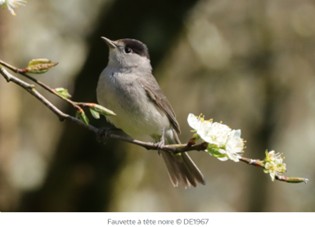 Et dans les buissons, là, vous l’avez vu ? Écoutez-la. C’est la Fauvette à tête noire. Son chant est assez complexe, mais son cri est très caractéristique. On dirait deux galets que l’on tape l’un contre l’autre, avec une pause entre chaque coup.