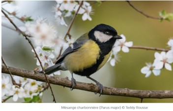 Et là, dans l’arbre ! Nombreux sont ceux qui entendent ce chant. C’est une phrase simple de « ti-tu » ou « ti-ti-tu » répétée. C’est la mésange charbonnière.